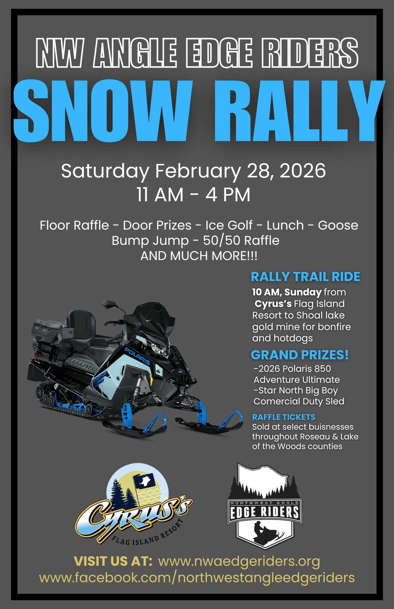Snowmobile enthusiasts across the region have a reason to mark their calendars. The Northwest Angle Edge Riders snowmobile club will hold their 2026 Snow Rally on Saturday, February 28th from 11 AM to 4 PM at Cyrus’s Flag Island Resort in the Northwest Angle area of Lake of the Woods.