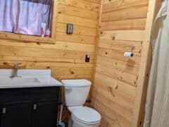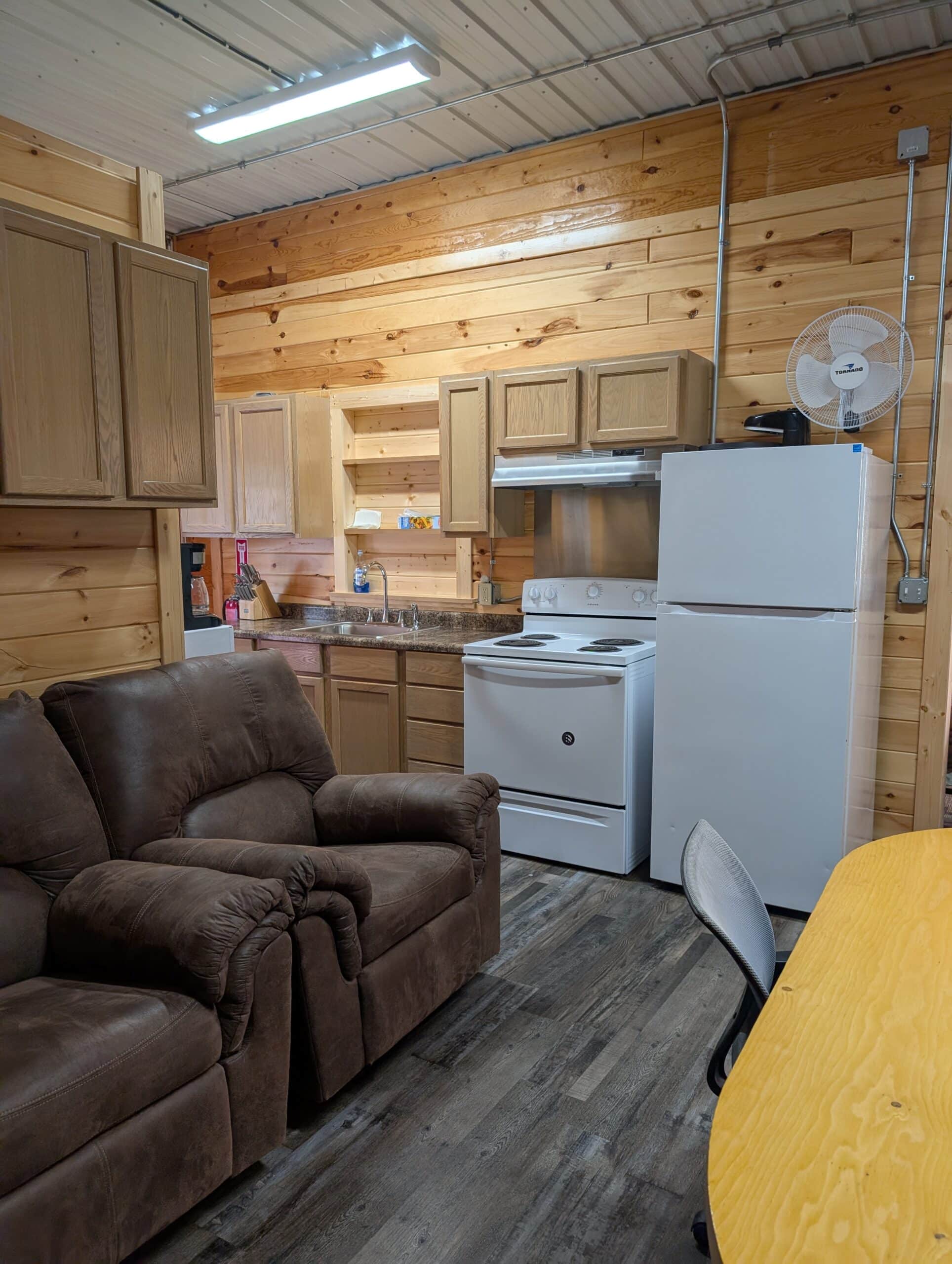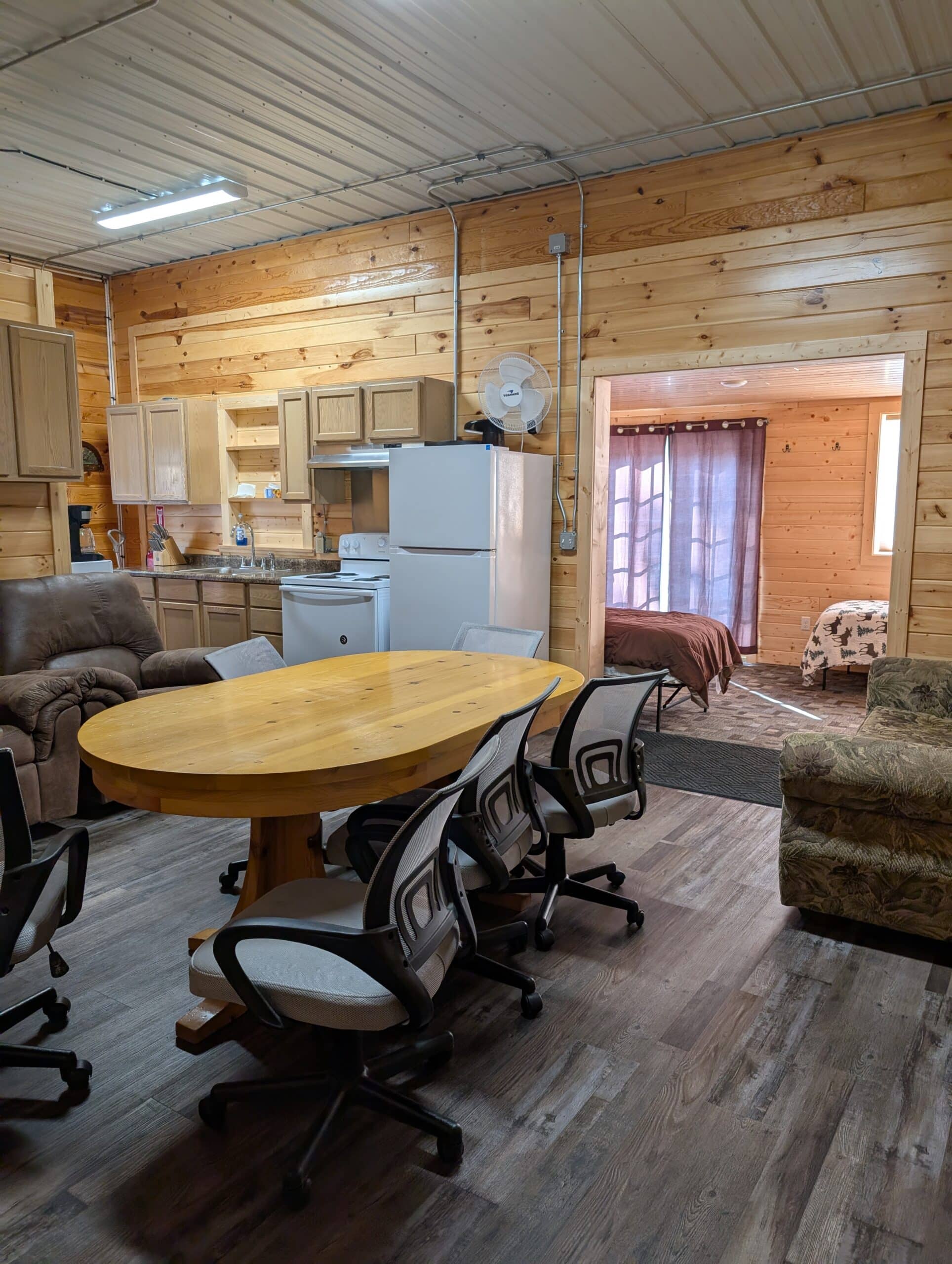 This newly remodeled cabin sleeps 9 and has 2 bathrooms has plenty of off street parking for up to 5 trucks with ice houses/ boat trailers.